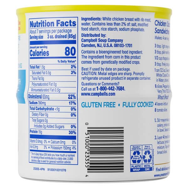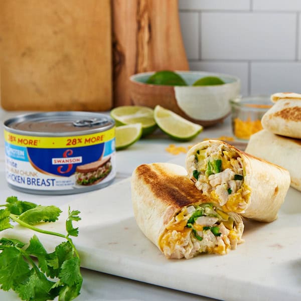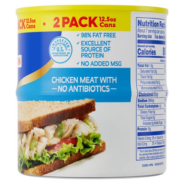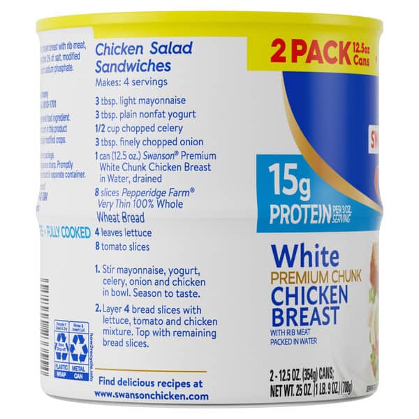 Enjoy a delicious shortcut to your favorite chicken dishes with Swanson® White Premium Chunk Canned Chicken Breast in Water. Living up to Swanson’s tradition of simple ingredients, our ready-to-eat, fully cooked chicken chunks contain no antibiotics, added MSG or artificial flavors. This premium white chicken meat is 98% fat free, gluten free and an excellent source of protein, with 15 grams in each 3-ounce serving. Eat it on crackers, add it to salads, or use it in any recipe that calls for diced chicken breast. It’s perfect for making homemade buffalo chicken dip, chicken salad, chicken quesadillas, chicken alfredo and more. Each 12.5-ounce can contains 3.5 servings of fully cooked chicken breast chunks. Create quick and easy everyday meals and sides with Swanson® White Premium Chunk Chicken in a Can.