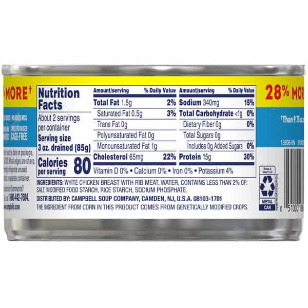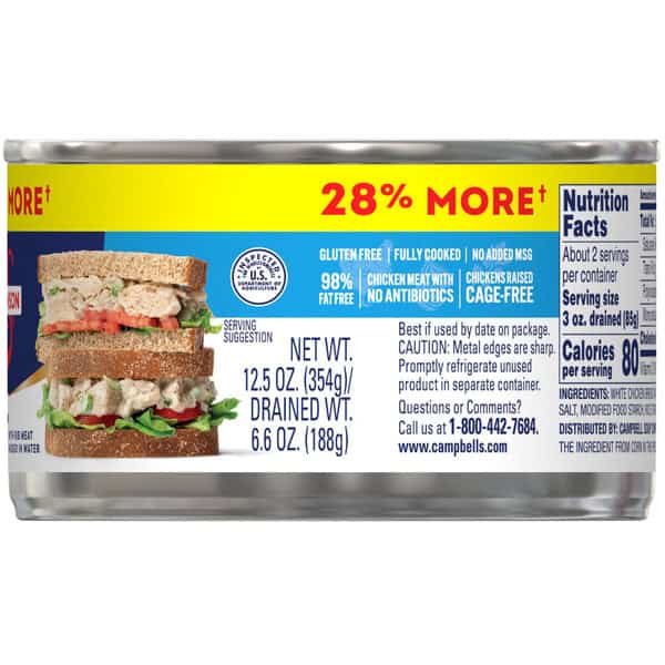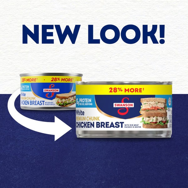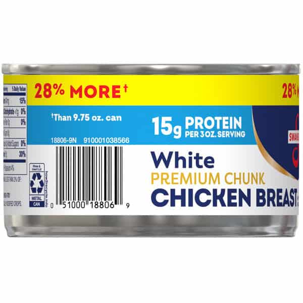 Enjoy a delicious shortcut to your favorite chicken dishes with Swanson® White Premium Chunk Canned Chicken Breast in Water. Living up to Swanson?s tradition of simple ingredients, our ready-to-eat, fully cooked chicken chunks contain no antibiotics, added MSG or artificial flavors. This premium white chicken meat is 98% fat free, gluten free and an excellent source of protein, with 15 grams in each 3-ounce serving. Eat it on crackers, add it to salads, or use it in any recipe that calls for diced chicken breast. It?s perfect for making homemade buffalo chicken dip, chicken salad, chicken quesadillas, chicken alfredo and more. Each 12.5-ounce can contains 3.5 servings of fully cooked chicken breast chunks. Create quick and easy everyday meals and sides with Swanson® White Premium Chunk Chicken in a Can.