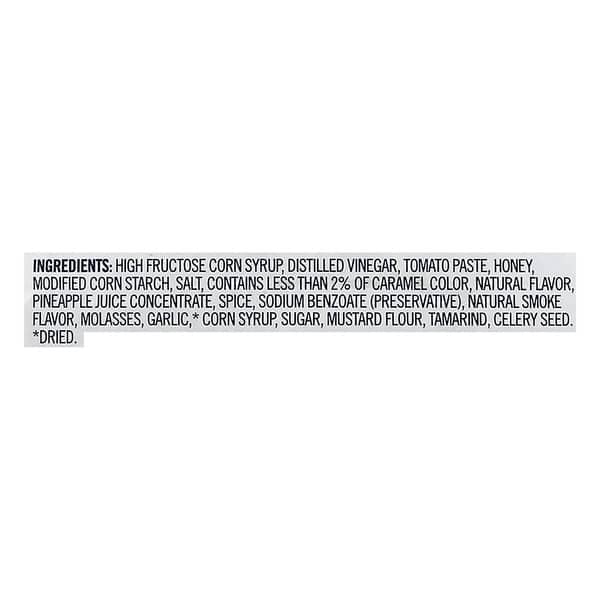 High Fructose Corn Syrup, Distilled Vinegar, Tomato Paste, Honey, Modified Corn Starch, Salt, Contains Less Than 2% Of Caramel Color, Natural Flavor, Pineapple Juice Concentrate, Spice, Sodium Benzoate (preservative), Natural Smoke Flavor, Molasses, Garlic, Corn Syrup, Sugar, Mustard Flour, Tamarind, Celery Seed.