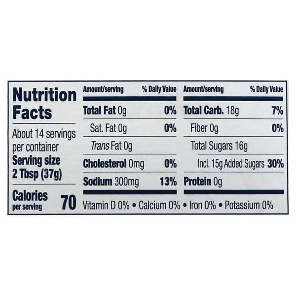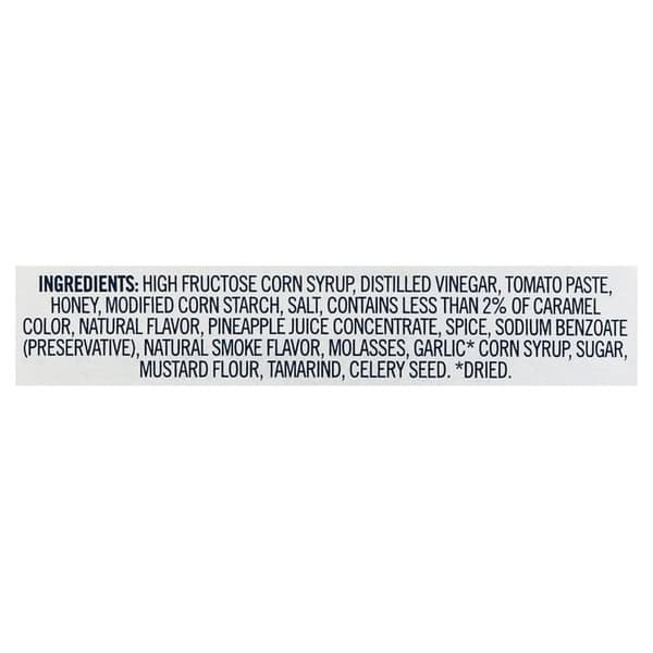 High Fructose Corn Syrup, Distilled Vinegar, Tomato Paste, Honey, Modified Corn Starch, Salt, Contains Less Than 2% Of Caramel Color, Natural Flavor, Pineapple Juice Concentrate, Spice, Sodium Benzoate (preservative), Natural Smoke Flavor, Molasses, Garlic,* Corn Syrup, Sugar, Mustard Flour, Tamarind, Celery Seed.