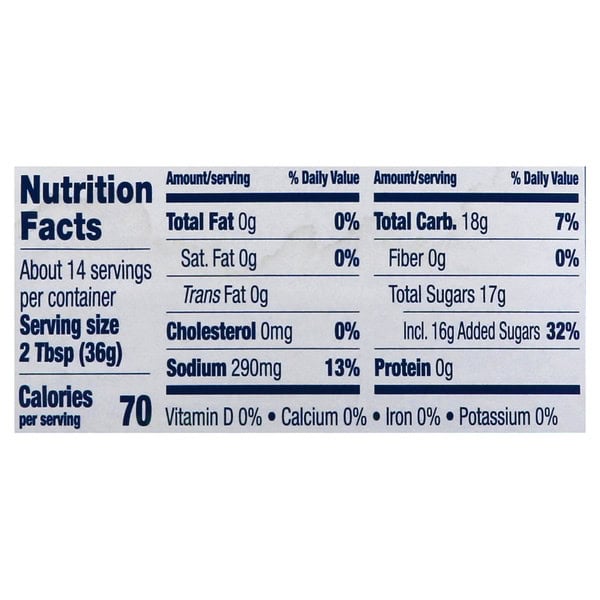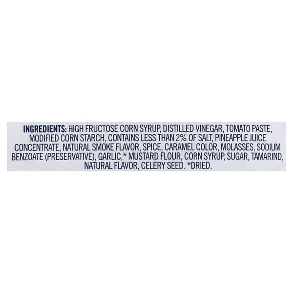High Fructose Corn Syrup, Distilled Vinegar, Tomato Paste, Modified Corn Starch, Contains Less Than 2% Of Salt, Pineapple Juice Concentrate, Natural Smoke Flavor, Spice, Caramel Color, Molasses, Sodium Benzoate (preservative), Garlic,* Mustard Flour, Corn Syrup, Sugar, Tamarind, Natural Flavor, Celery Seed.