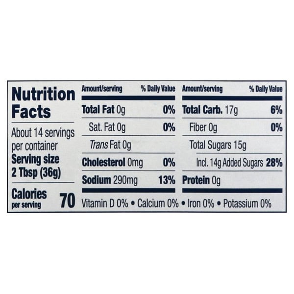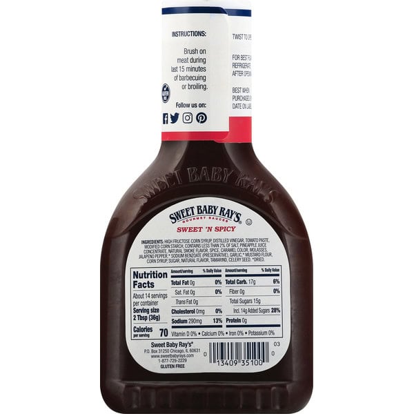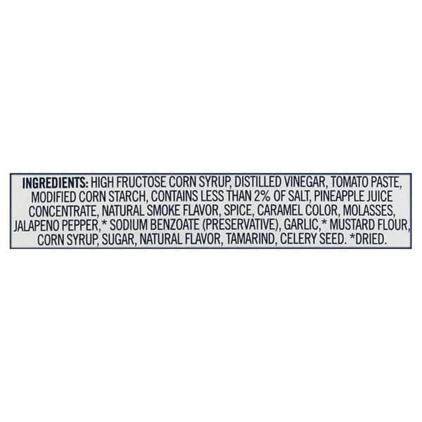 High Fructose Corn Syrup, Distilled Vinegar, Tomato Paste, Modified Corn Starch, Contains Less Than 2% Of Salt, Pineapple Juice Concentrate, Natural Smoke Flavor, Spice, Caramel Color, Molasses, Jalapeno Pepper, Sodium Benzoate (preservative), Garlic, Mustard Flour, Corn Syrup, Sugar, Natural Flavor, Tamarind, Celery Seed.