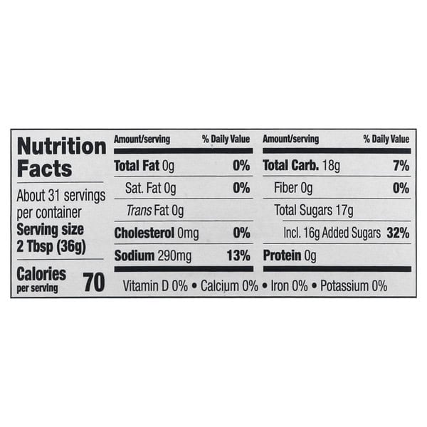 High Fructose Corn Syrup, Distilled Vinegar, Tomato Paste, Modified Corn Starch, Contains Less Than 2% Of Salt, Pineapple Juice Concentrate, Natural Smoke Flavor, Spice, Caramel Color, Molasses, Sodium Benzoate (preservative), Garlic,* Mustard Flour, Corn Syrup, Sugar, Tamarind, Natural Flavor, Celery Seed.