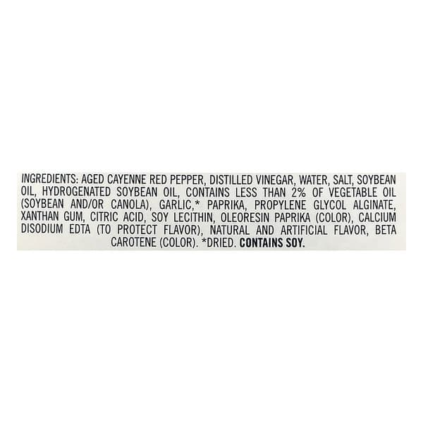 Aged Cayenne Red Pepper, Distilled Vinegar, Water, Salt, Soybean Oil, Hydrogenated Soybean Oil, Contains Less Than 2% Of Vegetable Oil (soybean And/or Canola), Garlic, Paprika, Propylene Glycol Alginate, Xanthan Gum, Citric Acid, Soy Lecithin, Oleoresin Paprika (color), Calcium Disodium Edta (to Protect Flavor), Natural And Artificial Flavor, Beta Carotene (color).