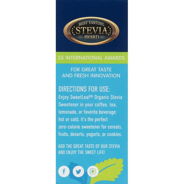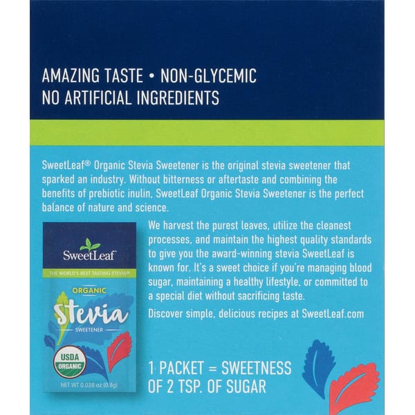 SweetLeaf Organic Stevia Sweetener is the original stein sweetener that sparked an industry. Without bitterness or aftertaste and combining the benefits of prebiotic maim. Sweetleaf Organic Stevia Sweetener is the perfect balance of nature and science. SweetLeaf Organic Stevia Sweetener is the original stein sweetener that sparked an industry. Without bitterness or aftertaste and combining the benefits of prebiotic maim. Sweetleaf Organic Stevia Sweetener is the perfect balance of nature and science. We harvest the purest leaves, utilize the cleanest processes, and maintain the highest quality standards to give you the award-winning stem SweetLeaf is known for. It’s a sweet choice if you’re managing blood sugar. Maintaining a healthy lifestyle, or committed to a special diet without sacrificing taste.