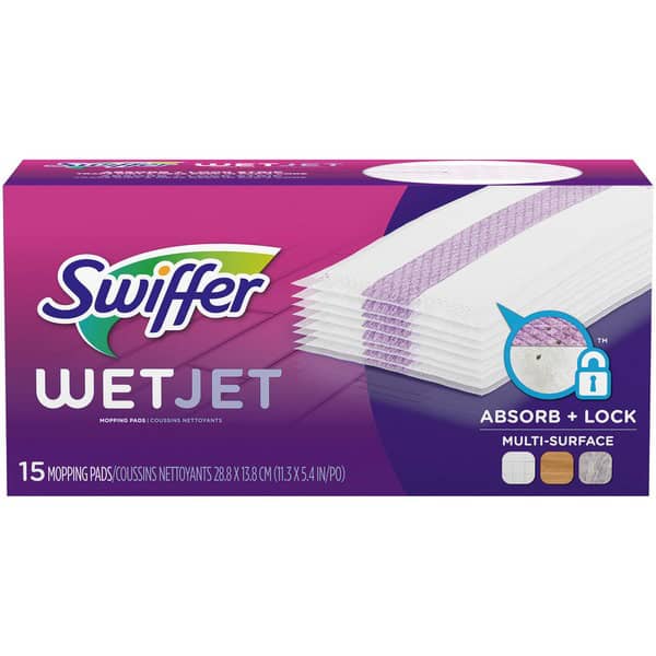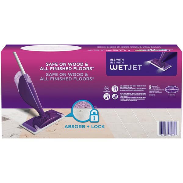 Swiffer WetJet Multi Surface mopping pads have an ABSORB + LOCK STRIP that helps trap dirt & grime deep in the mop pad so it does not get pushed around. It is safe on finished wood floors*. When you are done, just remove the pad and throw it, and all that dirt, away forever. For best end results on your hardwood floor, use with Swiffer WetJet solutions. Also try Swiffer WetJet Heavy Duty! Contains an extra SCRUBBING STRIP with the power of Magic Eraser. There is a perfect solution for any cleaning need. *Do not use on unfinished, oiled or waxed wooden boards, non-sealed tiles or carpeted floors because they may be water sensitive.