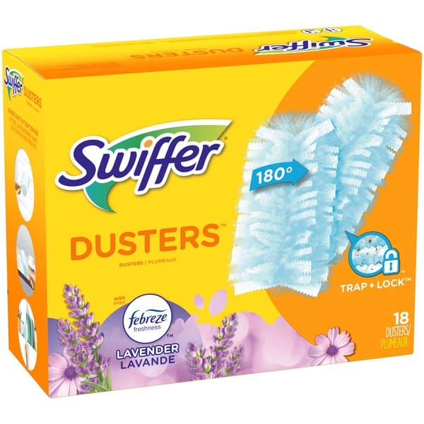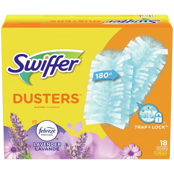 Swiffer Dusters TRAP + LOCK dust & allergens*. Made with specially coated fibers that grab onto dust & don’t let go. They are uniquely designed to Trap + Lock dust from even the tight spaces in your home. *common inanimate allergens from cat and dog dander & dust mite matter