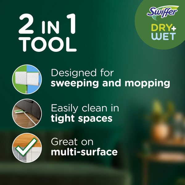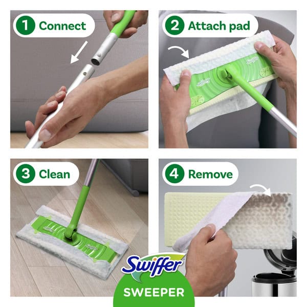 Swiffer Sweeper is a 2-in-1 multi-surface hard surface floor cleaner designed for both sweeping and mopping – no dustpan or bucket required! First, use a Dry Sweeping Cloth. With deep ridges and grooves that conform to the surface of your floor, TRAP AND LOCK dirt, dust and hair. Next, use a Wet Mopping Pad to dissolve dirt and grime and trap it away, giving you an amazing clean. Enjoy the convenient combination of a broom and mop for a quick and easy clean that gets dirt out of your home once and for all. Refill cloths available.