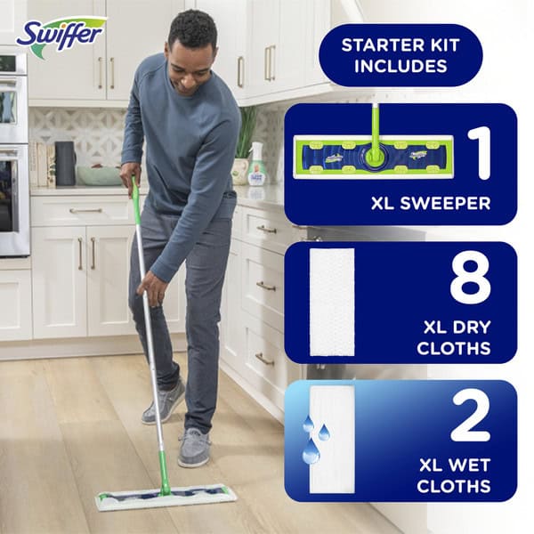 • Starter Kit includes 1 XL Sweeper, 8 XL Dry Sweeping Cloths, 2 XL Wet Mopping Cloths
