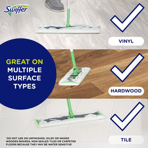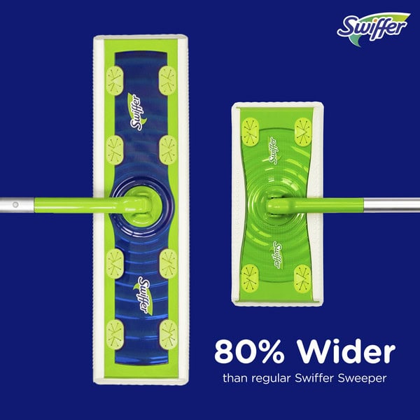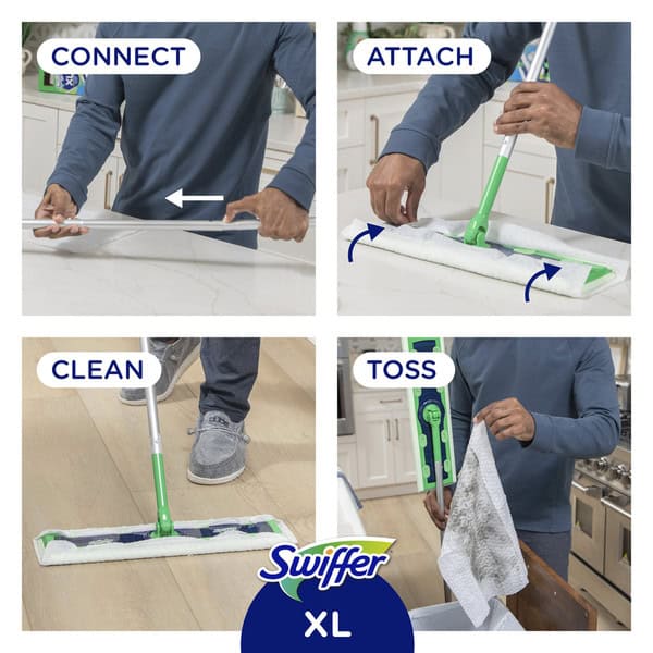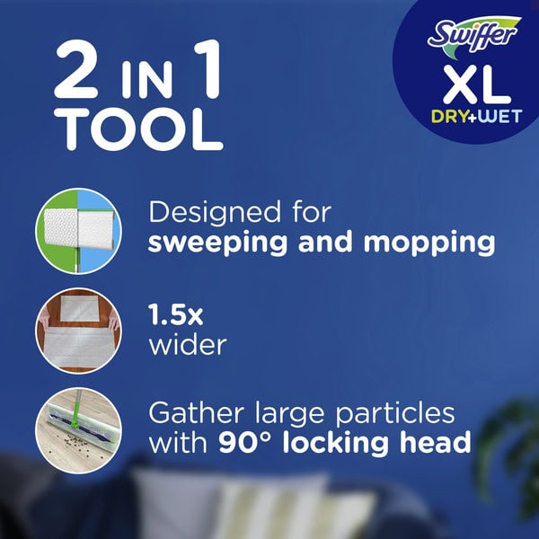 Swiffer Sweeper XL is a 2-in-1 multi-surface hard floor cleaner designed for both sweeping and mopping. Enjoy the convenient combination of a broom and mop for a quick and easy clean that gets dirt out of your home once and for all – no dustpan or bucket required! First, use a Dry Sweeping Cloth. With deep ridges and grooves that conform to the surface of your floor, TRAP AND LOCK dirt, dust and hair. Next, use a Wet Mopping Pad to dissolve dirt and grime and trap it away, giving you an amazing clean. Enjoy the convenient combination of a broom and mop for a quick and easy clean that gets dirt out of your home once and for all. Swiffer XL is 1.5X wider* than regular Swiffer Sweeper so you can tackle larger areas. *vs. Regular Swiffer Sweeper. Refill cloths available.