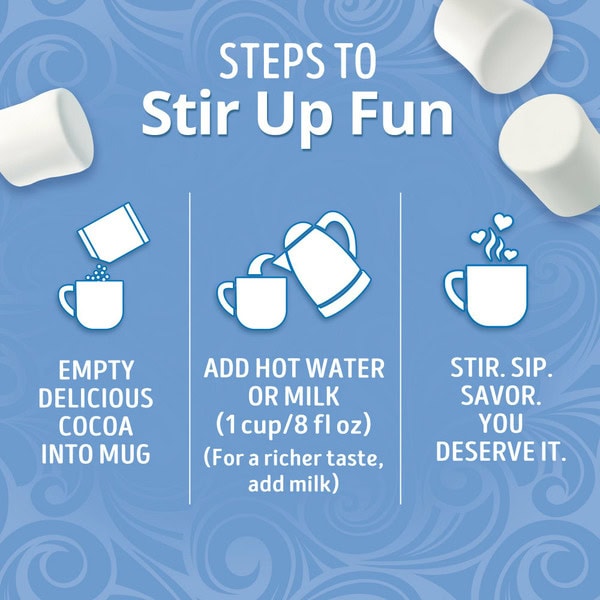 Empty delicious cocoa into mug. Add hot water or milk (1 cup/8 fl oz) for richer taste add milk. Stir. Sip. Savor. You deserve it.