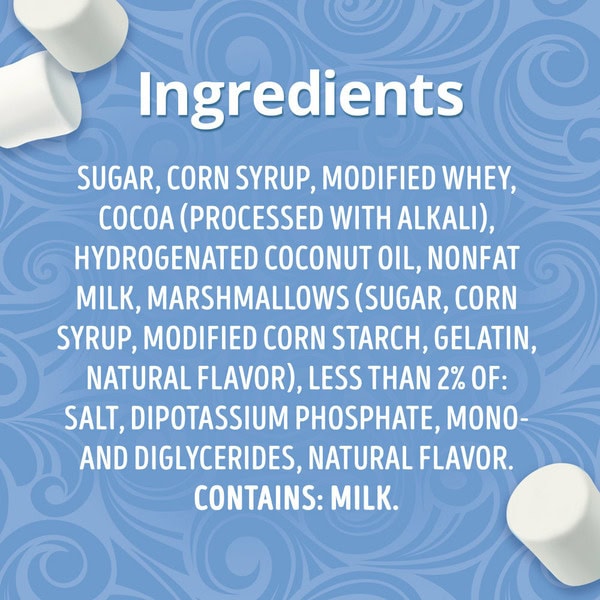 Sugar, Corn Syrup, Modified Whey, Cocoa (processed With Alkali), Hydrogenated Coconut Oil, Nonfat Milk, Marshmallows (sugar, Corn Syrup, Modified Corn Starch, Gelatin, Natural Flavor), Less Than 2% Of: Salt, Dipotassium Phosphate, Mono- And Diglycerides, Natural Flavor