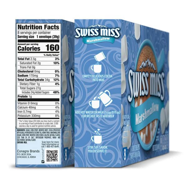 Swiss Miss Chocolate Hot Cocoa Mix With Marshmallows makes a warm, delightful hot cocoa drink with mini marshmallows that will bring you comfort and everyday warmth whenever you need it. This hot cocoa drink mix easily transforms into a rich, creamy hot cocoa with marshmallows that delivers on that timeless flavor your family has always known and loved. Swiss Miss Hot Cocoa Mix is packaged in individual packets so every mug you make is equally delicious. You won’t miss your old hot chocolate with marshmallows. This chocolate hot cocoa powder is made with real cocoa and nonfat milk to give you that comforting, rich and creamy taste you expect from Swiss Miss. Not only is this a gluten free hot cocoa mix, but it’s made with no artificial sweeteners, preservatives, flavors or colors. Preparing a delicious mug of this hot cocoa is easy. Empty the chocolatey cocoa mix into a mug, add 8 ounces of hot water (or milk for a richer taste) and stir. Enjoy a mug as part of your morning routine, on chilly days or as a sweet evening treat. You can use this cocoa mix in different ways. Try making a tasty iced cocoa drink to cool you down, or incorporate the hot cocoa mix into your recipes for brownies, cookies, cakes and more. Whatever you’re warming up to, know that Swiss Miss will give you everything you need in the palm of your hands.