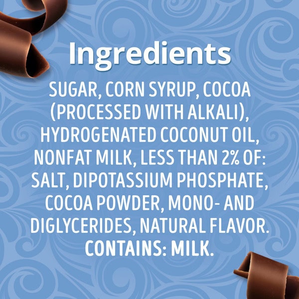 Sugar, Corn Syrup, Cocoa (processed With Alkali), Hydrogenated Coconut Oil, Nonfat Milk, Less Than 2% Of: Salt, Dipotassium Phosphate, Cocoa Powder, Mono- And Diglycerides, Natural Flavor.