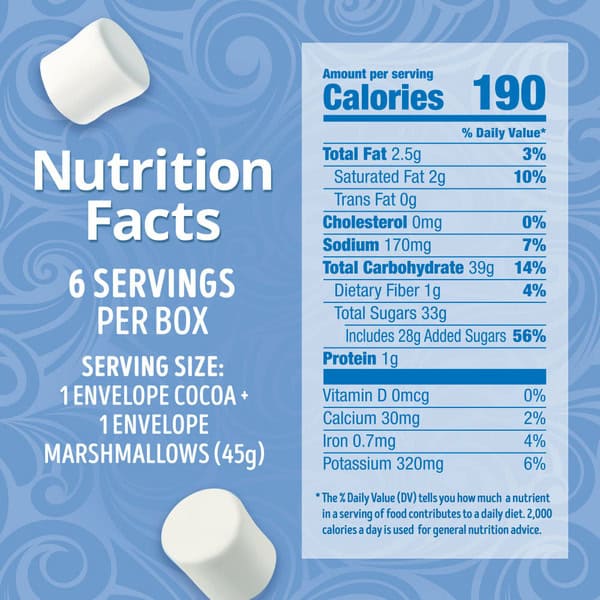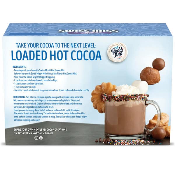 Swiss Miss Marshmallow Lovers Hot Cocoa Mix makes a warm, delightful hot cocoa drink that will bring you comfort and everyday warmth whenever you need it. This hot cocoa drink mix easily transforms into a rich, creamy hot cocoa with marshmallows that delivers on that timeless flavor your family has always known and loved. Swiss Miss Hot Cocoa Mix is packaged in individual packets with separate marshmallow packets so every mug you make is equally delicious. You won’t miss your old hot chocolate with marshmallows. This hot cocoa powder is made with real cocoa and nonfat milk to give you that comforting, rich and creamy taste you expect from Swiss Miss. Not only is this a gluten free hot cocoa mix, but it’s made with no artificial sweeteners, preservatives, flavors or colors. Preparing a delicious mug of this hot cocoa is easy. Empty the chocolatey cocoa mix into a mug, add 8 ounces of hot water (or milk for a richer taste) and stir. Then add in one pack of the delicious marshmallows to top it off. Enjoy a mug as part of your morning routine, on chilly days or as a sweet evening treat. You can use this cocoa mix in different ways. Try making a tasty iced cocoa drink to cool you down, or incorporate the hot cocoa mix into your recipes for brownies, cookies, cakes and more. Whatever you’re warming up to, know that Swiss Miss will give you everything you need in the palm of your hands.