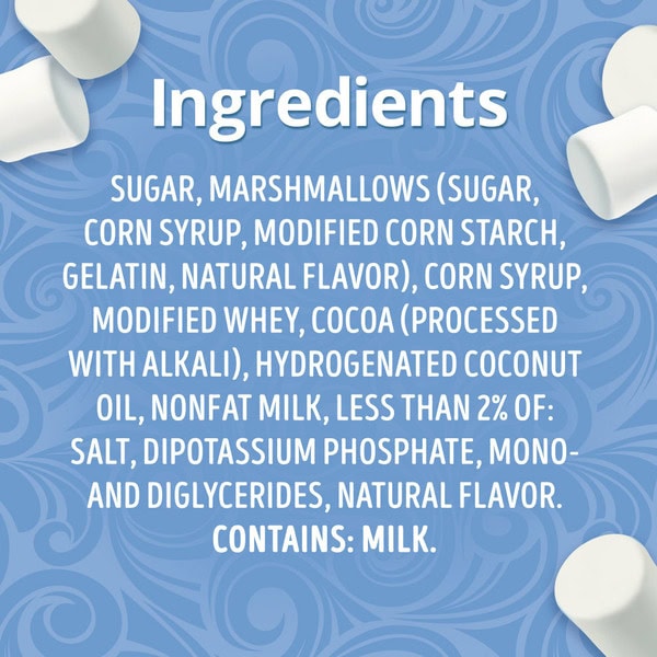 Sugar, Marshmallows (sugar, Corn Syrup, Modified Corn Starch, Gelatin, Natural Flavor), Corn Syrup, Modified Whey, Cocoa (processed With Alkali), Hydrogenated Coconut Oil, Nonfat Milk, Less Than 2% Of: Salt, Dipotassium Phosphate, Mono- And Diglycerides, Natural Flavor