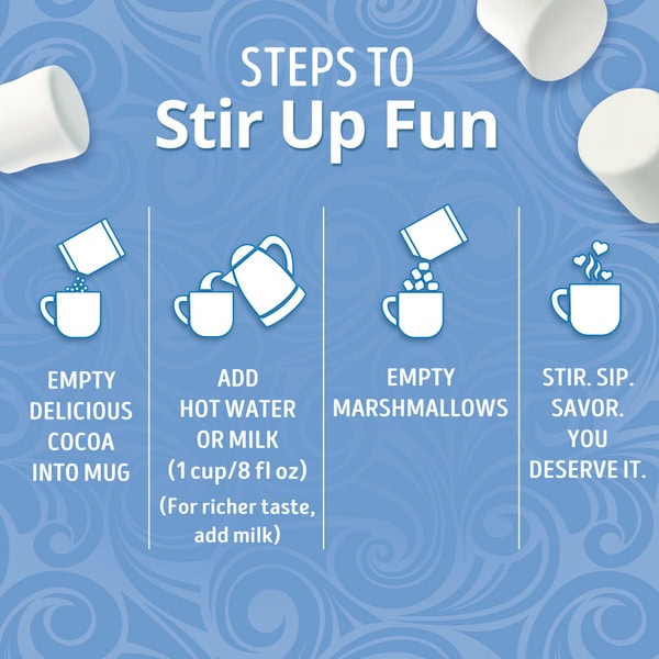 1. Empty delicious cocoa into mug. 2. Add 8 oz of hot water (for richer taste add milk). 3. Empty marshmallows. 4. Stir. Sip. Enjoy you deserve it.