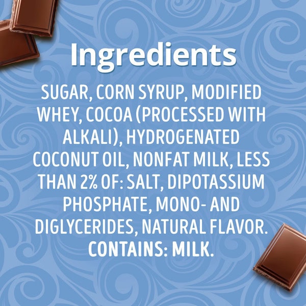 Sugar, Corn Syrup, Modified Whey, Cocoa (processed With Alkali), Hydrogenated Coconut Oil, Nonfat Milk, Less Than 2% Of: Salt, Dipotassium Phosphate, Mono- And Diglycerides, Natural Flavor.