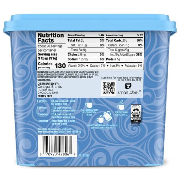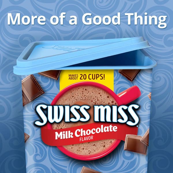 Swiss Miss Milk Chocolate Flavored Hot Cocoa Mix makes a warm, delightful hot cocoa drink that will bring you comfort and everyday warmth whenever you need it. This hot cocoa drink mix easily transforms into a rich, creamy hot cocoa that delivers on that timeless flavor your family has always known and loved. Swiss Miss Hot Cocoa Mix is packaged in a large canister with about 20 servings so everyone can make their hot cocoa just how they like it. You won’t miss your old hot chocolate. This hot cocoa powder is made with real cocoa and nonfat milk to give you that comforting, rich and creamy taste you expect from Swiss Miss. Not only is this a gluten free hot cocoa mix, but it’s also made with no artificial sweeteners, preservatives, flavors or colors. Preparing a delicious mug of this hot cocoa is easy. Add 3 tablespoons to a mug, add 8 ounces of hot water (or milk for a richer taste) and stir. Enjoy a mug as part of your morning routine, on chilly days or as a sweet evening treat. You can use this cocoa mix in different ways. Try making a tasty iced cocoa drink to cool you down, or incorporate the hot cocoa mix into your recipes for brownies, cookies, cakes and more. Whatever you’re warming up to, know that Swiss Miss will give you everything you need in the palm of your hands.