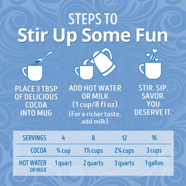 Place 3 tablespoons delicious cocoa in mug. Stir, sip, savor. You deserve it. Add hot water or milk (1 cup/8 fl oz) for richer taste add milk. 4 Servings: 1 cup cocoa and 1-quart hot water or milk. 8 Servings: 2 cups cocoa and 2-quarts hot water or milk. 12 Servings: 3 cups cocoa and 3-quarts hot water or milk. 16 Servings: 4 cups cocoa and 1 gallon hot water or milk.