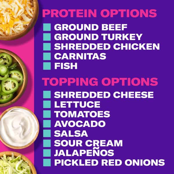 • Serve your crunchy Taco Bell tacos with salsa, sour cream, cheese, lettuce, tomatoes and more