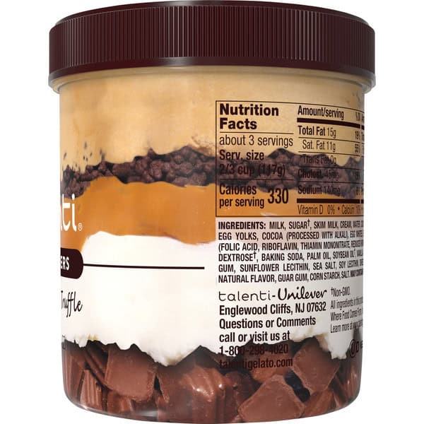 • Talenti Salted Caramel Truffle features our delicious sea salt caramel gelato surrounded by layers of chocolate cookie crumbs, vanilla gelato, dulce de leche, and chocolate coated caramel truffles
