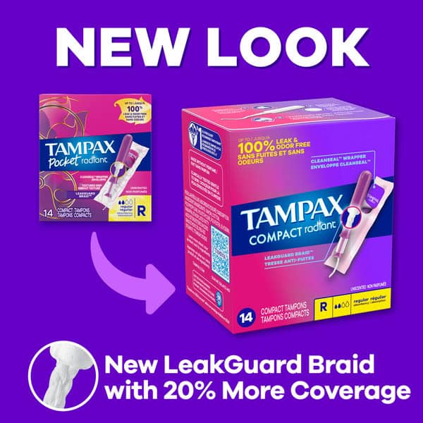 It’s a new time for that time of the month. Get up to 100% leak and odor-free protection with Tampax Radiant Compact tampons – the same incredible protection of Tampax Radiant tampons in a compact extendable applicator. Designed to go wherever you go. Tampax Radiant Compact tampons have a LeakGuard Braid to help stop leaks before they even happen. Plus, they come in a CleanSeal Wrapper created for more ease, more clean, and more hygiene – to help dispose of them wherever you are.* Tampax Radiant Compact tampons have an anti-slip grip for easy and comfortable placement. Protection you can count on is as easy as 1-2-3 with Tampax Radiant Compact. Step 1: Pull out the Pusher. Step 2: Click it into Place. Step 3: Push to insert. Choose from three different absorbencies to match your changing flow. Got leaks? Go up an absorbency. Uncomfortable to remove? Go down an absorbency. Tampax Radiant Compact Tampons have a smooth comfort layer for easy removal, even on your light days. How to insert a tampon: Slowly insert the tampon applicator from the tip, all the way to the grip. After you’ve pushed the plunger in all the way, pull the applicator out. How to remove a tampon: You’ll use your thumb and finger to grip the string and pull it slowly out. Properly dispose of your tampon in the trash. Tampax Tampons are made without perfume and latex. Plus, Tampax products are OEKO TEX standard 100 certified, meaning they are tested for up to 1,000 harmful substances.** Ready to ditch the leaks? Get amazing protection with Tampax, the #1 tampon brand recommended by U.S. Gynecologist.*** Discover your perfect flow combo and get the protection you need. (*vs Tampax Pearl **Certificate #24.HUS.14474 ***based on 2024 survey)
