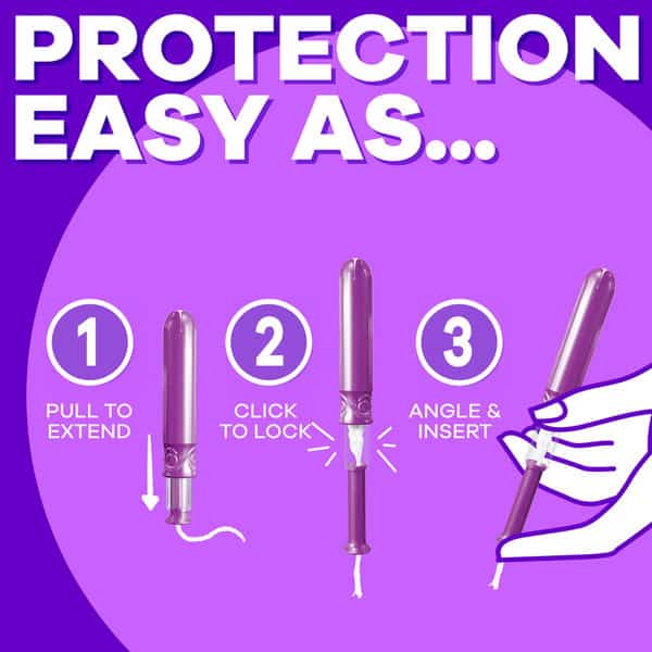 USE FOR 8 HOURS MAXIMUM. TAMPONS COME IN STANDARDIZED INDUSTRY-WIDE ABSORBENCIES. USE THE CHART FOR COMPARING ABSORBENCIES OF ALL INDUSTRY PRODUCTS.1. PULL TO EXTEND.2. CLICK TO LOCK.3. READY TO USE!
