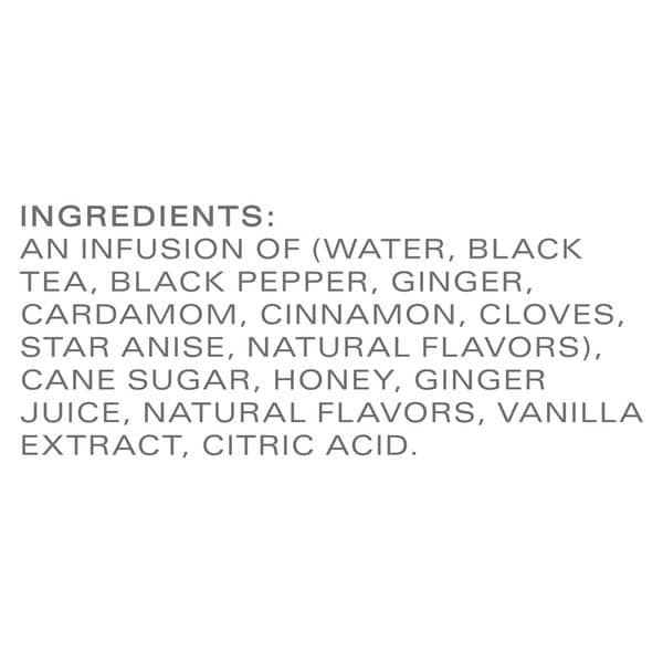 An Infusion Of (water, Black Tea, Black Pepper, Ginger, Cardamom, Cinnamon, Cloves, Star Anise, Natural Flavors), Cane Sugar, Honey, Ginger Juice, Natural Flavors, Vanilla Extract, Citric Acid