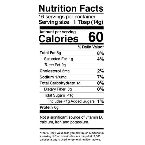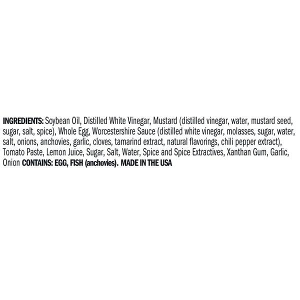 Soybean Oil, Water, Mustard (distilled Vinegar, Water, Mustard Seed, Sugar, Salt, Spice), Worcestershire Sauce (distilled White Vinegar, Molasses, Sugar, Water, Salt, Onions, Anchovies, Garlic, Cloves, Tamarind Extract, Natural Flavorings, Chili Pepper Extract), Vinegar, Tomato Paste, Sugar, Egg, Salt, Black Pepper, Xanthan Gum, Garlic, Onion, Habanero Chile Powder, Dill Weed, Allspice, Cloves