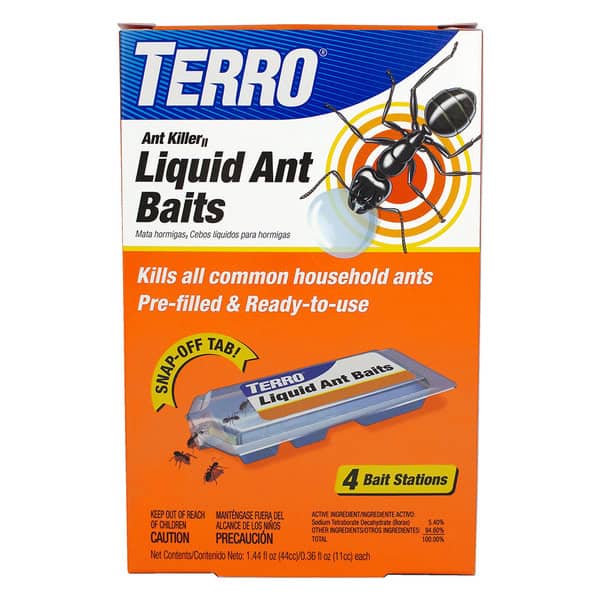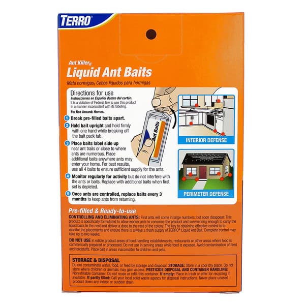 Keep out of reach of children. Caution. Controlling and Eliminating Ants: First ants will come in large numbers, but soon disappear. This product is specifically formulated to allow worker ants to consume the product and survive long enough to carry the liquid back to the nest and deliver a dose to the rest of the colony. The key to obtaining effective control is to monitor the placements and ensure there is always a fresh supply of Terro Liquid Ant Bait. Complete control may take up to two weeks. Do not use in edible product areas of food handling establishments, restaurants or other areas where food is commercially prepared or processed. Do not use in serving areas while food is exposed. Avoid contamination of feed and foodstuffs. Place bait in areas inaccessible to children and pets.