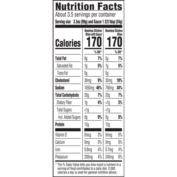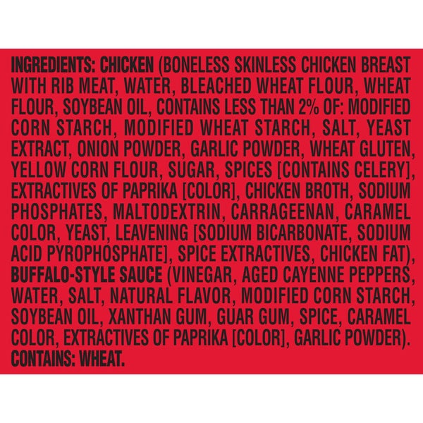 Chicken (boneless Skinless Chicken Breast With Rib Meat, Water, Bleached Wheat Flour, Wheat Flour, Soybean Oil, Contains Less Than 2%: Modified Food Starch, Modified Wheat Starch, Salt, Yeast Extract, Onion Powder, Garlic Powder, Wheat Gluten, Yellow Corn Flour, Sugar, Extractives Of Paprika, Spices, Chicken Broth, Sodium Phosphates, Maltodextrin, Carrageenan, Caramel Color, Yeast, Leavening (sodium Bicarbonate, Sodium Acid Pyrophosphate), Spice Extractives, Chicken Fat), Buffalo-style Sauce (vinegar, Aged Cayenne Peppers, Water, Salt, Natural Flavor, Modified Food Starch, Xanthan Gum, Guar Gum, Red Pepper, Caramel Color, Extractives Of Paprika, Garlic Powder).