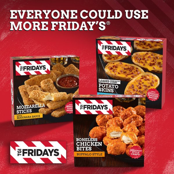 Enjoy your TGI Fridays menu favorites at home with our easy restaurant style appetizers. Ready to heat, TGI Fridays Buffalo Style Boneless Chicken Bites are a quick and delicious appetizer or party food. Our TGIF breaded chicken breast bites are coated in a spicy buffalo style sauce. Packaged in a box for convenient storage, you can heat our buffalo style chicken bites in the microwave or conventional oven. Store our 15-ounce box of buffalo style boneless chicken bites in the freezer until ready to prepare. Whether you’re craving chicken bites and wings, potato skins, spinach artichoke dip, mozzarella sticks, sliders or jalapeno poppers, TGI Fridays has frozen appetizers the whole family will enjoy.