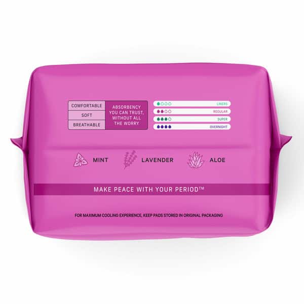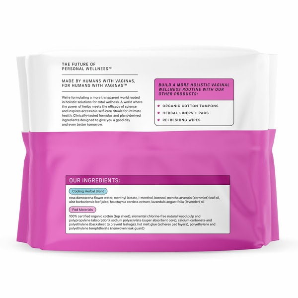 Use these OCS certified organic cotton cover feminine pads for soothing comfort and cool confidence. Our regular herbal sanitary pads are made with a super soft organic cotton top sheet and an ultra-absorbent pulp core for added protection. Infused with essential oils, which creates a cooling” sensation that makes for a more comfortable period. With lavender, rose, aloe vera, and mint, these cotton menstrual pads are designed to soothe and refresh.