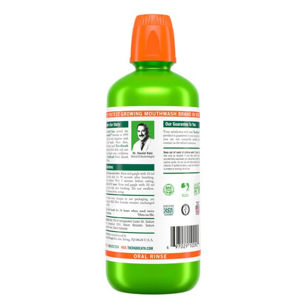 Bad breath is nothing to be ashamed of…everyone gets it! ADA accepted TheraBreath Fresh Breath Mouthwash has been fighting bad breath for over 25 years. When used as directed, it’s clinically shown to fight bad breath for 24 hours when used every 12 hours after brushing and flossing. This alcohol-free mouthwash doesn’t burn or irritate, and the oxygenating compound that fights bad breath starts working instantly. TheraBreath Fresh Breath Mouthwash has no artificial dyes and is certified kosher, vegan, and gluten-free. We’re so confident in the effectiveness of TheraBreath Oral Rinses that we back them up with our 100% guarantee. If you haven’t seen improvement in your breath, contact us within 30 days of purchase for a full refund. TheraBreath: It’s a better mouthwash, satisfaction 100% guaranteed!