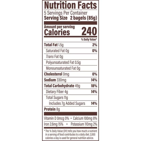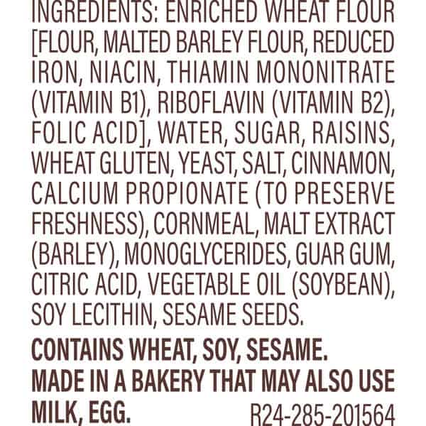 Enriched Wheat Flour [flour, Malted Barley Flour, Reduced Iron, Niacin, Thiamin Mononitrate (vitamin B1), Riboflavin (vitamin B2), Folic Acid], Water, Sugar, Raisins, Wheat Gluten, Yeast, Salt, Cinnamon, Calcium Propionate (to Preserve Freshness), Cornmeal, Malt Extract (barley), Monoglycerides, Guar Gum, Citric Acid, Vegetable Oil (soybean), Soy Lecithin, Sesame Seeds