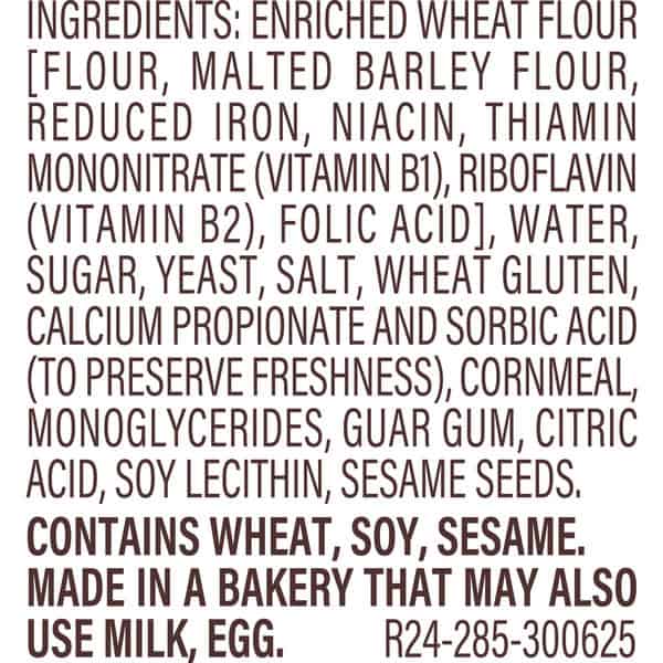 Enriched Wheat Flour [flour, Malted Barley Flour, Reduced Iron, Niacin, Thiamin Mononitrate (vitamin B1), Riboflavin (vitamin B2), Folic Acid], Water, Sugar, Yeast, Salt, Wheat Gluten, Calcium Propionate And Sorbic Acid (to Preserve Freshness), Cornmeal, Monoglycerides, Guar Gum, Citric Acid, Soy Lecithin, Sesame Seeds