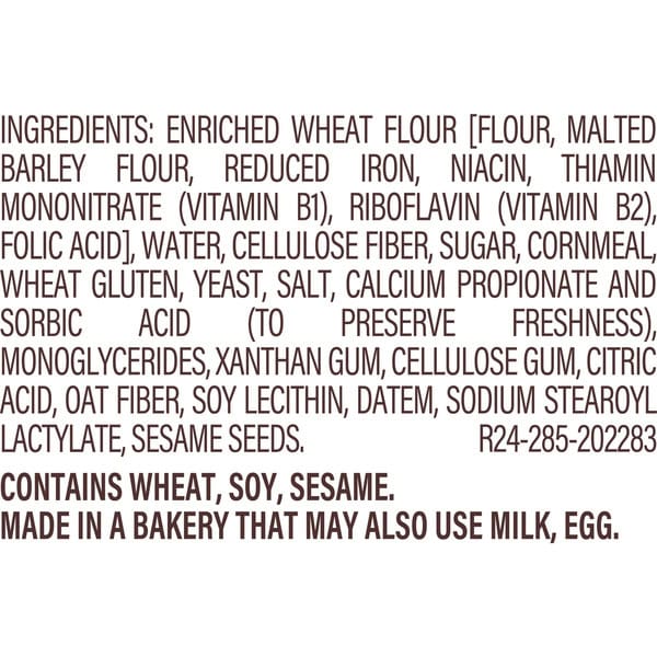 Enriched Wheat Flour [flour, Malted Barley Flour, Reduced Iron, Niacin, Thiamin Mononitrate (vitamin B1), Riboflavin (vitamin B2), Folic Acid], Water, Cellulose Fiber, Sugar, Cornmeal, Wheat Gluten, Yeast, Salt, Calcium Propionate And Sorbic Acid (to Preserve Freshness), Monoglycerides, Xanthan Gum, Cellulose Gum, Citric Acid, Oat Fiber, Soy Lecithin, Datem, Sodium Stearoyl Lactylate, Sesame Seeds