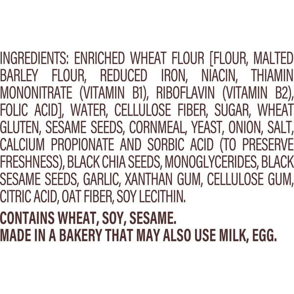 Enriched Wheat Flour [flour, Malted Barley Flour, Reduced Iron, Niacin, Thiamin Mononitrate (vitamin B1), Riboflavin (vitamin B2), Folic Acid], Water, Cellulose Fiber, Sugar, Wheat Gluten, Sesame Seeds, Cornmeal, Yeast, Onion, Salt, Calcium Propionate And Sorbic Acid (to Preserve Freshness), Black Chia Seeds, Monoglycerides, Black Sesame Seeds, Garlic, Xanthan Gum, Cellulose Gum, Citric Acid, Oat Fiber, Soy Lecithin