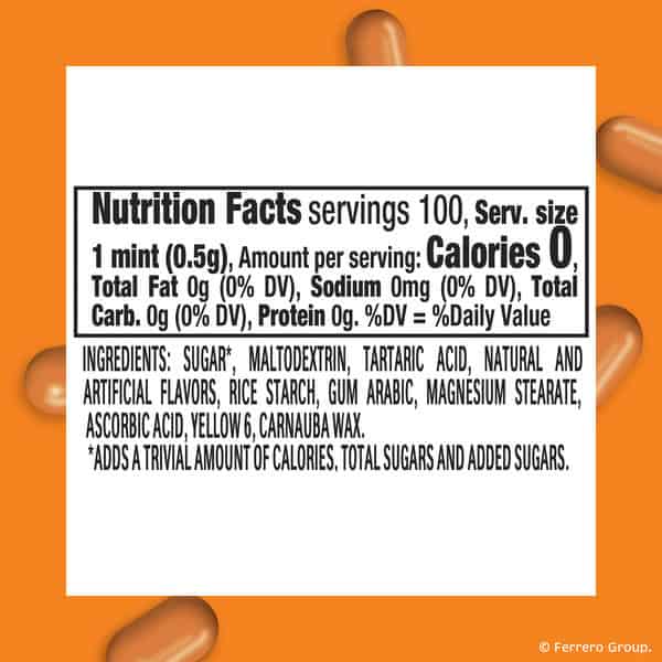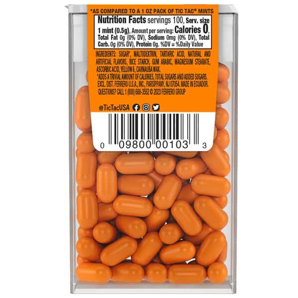 Enjoy the fun, fruity taste of Tic Tac Orange mints. This 1.7-ounce pack is filled with delicious mints ready to boost your confidence and refresh your day. Enjoy 100 layers of satisfying and delicious flavor in each mint in this pack of Tic Tac Orange mints. The portable pack fits perfectly in your pocket or purse for on-the-go sharing. These gluten-free mints are satisfying and GMO-free! Tic Tac is an iconic brand of beloved mints. Whether you enjoy one or the whole pack, you’ve got a variety of flavors and sizes to choose from. Take a ride on a Tic Tac.