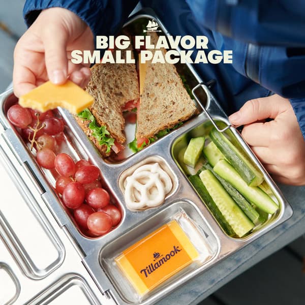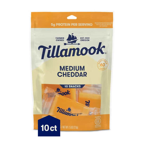 Tillamook Medium Cheddar Cheese Snack Portions are convenient, premium cheese snacks that are rich, bold and downright delicious. Featuring a creamy cheddar flavor, these pre-sliced naturally aged cheddar snack cheese cuts are delectably perfect lunch snacks worth looking forward to every time. Plus, they’re full of flavor, making these Tillamook cheddar cheese snacks an instant crowd-pleaser as scrumptious party snacks at Thanksgiving or Halloween celebrations. The resealable container makes storage easier and keeps your Tillamook Cheddar Cheese fresh. Tillamook Cheese tastes better because it’s made right. This aged cheddar cheese uses high-quality pasteurized milk from cows not treated with rBST* and never includes artificial flavors or preservatives. Better yet, you can be assured that each purchase you make helps support Tillamook in their pursuit to do right. As a Certified B Corp, Tillamook is committed to being good stewards of cows and farms, of people and products, their communities and the environment. With over 110 years of quality cheese-making experience backing them, Tillamook Cheese Snacks have a taste to remember. *The FDA has stated that no significant difference has been shown between milk derived from rBST treated and non-rBST treated cows.