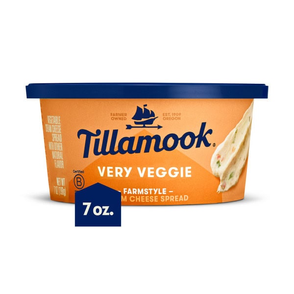 For real taste worth spreading, grab Tillamook Very Veggie Farmstyle Cream Cheese Spread. Featuring a satisfying smooth veggie cream cheese flavor, this rich, creamy and tangy spread will make every snack, bagel and recipe extraordinary. Smooth and slightly buttery, this spreadable cream cheese spread has a veggie taste that makes every bite more delicious. Use this versatile cream cheese spread to add delicious flavor to your favorite foods and recipes. Tillamook Cream Cheese Spread is a rich product that has a real, unmatched flavor because it’s made better. This soft cream cheese spread is kosher, pasteurized and uses natural flavors. You’ll feel good about eating and sharing this garden vegetable cream cheese, because it uses high-quality cream from cows not treated with rBST* and uses no fillers, gums, stabilizers, artificial flavors or preservatives. Better yet, you can be assured that each purchase you make helps support Tillamook in their pursuit to do right. As a farmer-owned Certified B Corp, Tillamook is committed to being good stewards of cows and farms, of people and products, their communities and the environment. With over 110 years of quality dairy-making experience backing them, this Tillamook Cream Cheese has a taste to remember. Do Right By Every Bite.