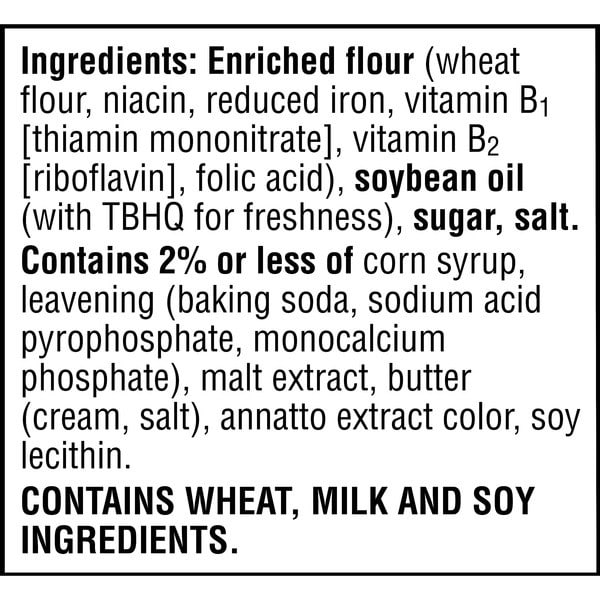 Enriched Flour (wheat Flour, Niacin, Reduced Iron, Thiamin Mononitrate [vitamin B1], Riboflavin [vitamin B2], Folic Acid), Soybean Oil With Tbhq For Freshness, Sugar, Contains Two Percent Or Less Of Salt, Corn Syrup, Leavening (baking Soda, Sodium Acid Pyrophosphate, Monocalcium Phosphate), Malt Extract, Butter+ (cream, Salt), Cornstarch, Annatto Color, Soy Lecithin.