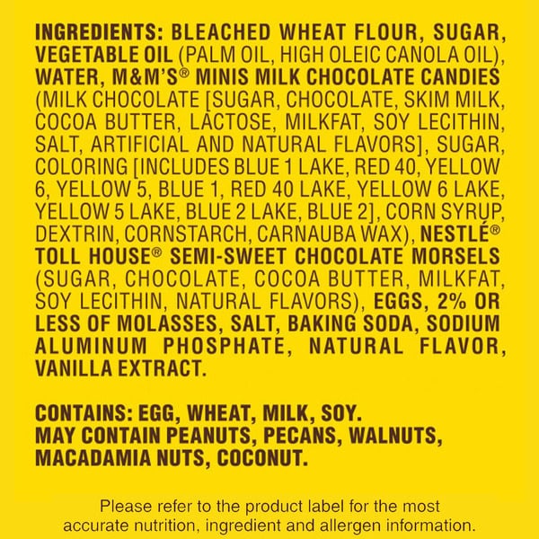 Bleached Wheat Flour, Sugar, Vegetable Oil (palm Oil And/or Soybean Oil And/or High Oleic Canola Oil), Water, M&m’s Minis Milk Chocolate Candies (milk Chocolate [sugar, Chocolate, Skim Milk, Cocoa Butter, Lactose, Milkfat, Soy Lecithin, Salt, Natural Flavors], Sugar, Coloring [includes Blue 1 Lake, Red 40, Yellow 6, Yellow 5, Blue 1, Red 40 Lake, Yellow 6 Lake, Yellow 5 Lake, Blue 2 Lake, Blue 2], Corn Syrup, Dextrin, Cornstarch, Carnauba Wax), Nestle Toll House Semi-sweet Chocolate Morsels (sugar, Chocolate, Cocoa Butter, Milkfat, Soy Lecithin, Natural Flavors), Eggs, 2% Or Less Of Molasses, Salt, Baking Soda, Sodium Aluminum Phosphate, Natural Flavor.