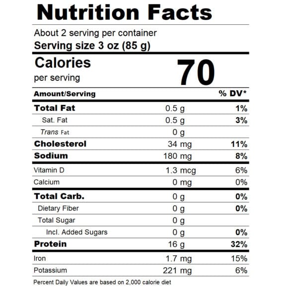 Tuna fish, water and sea salt. Gluten free, Non-GMO verified, Dolphin safe, Kosher