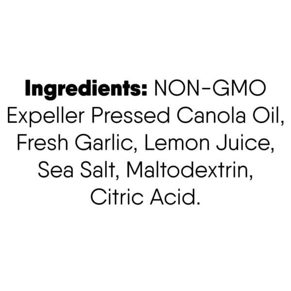 IngredientsNON-GMO Expeller Pressed Canola Oil, Fresh Garlic, Lemon Juice, Maltodextrin, Sea Salt, Citric Acid.
