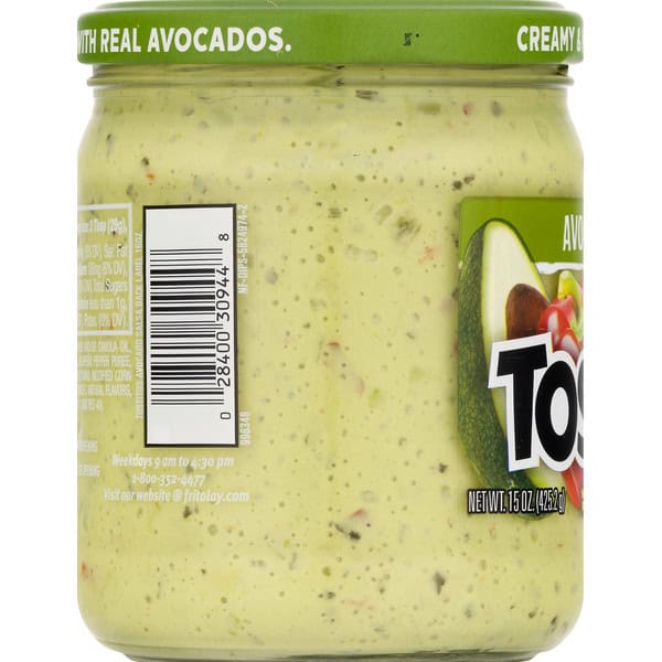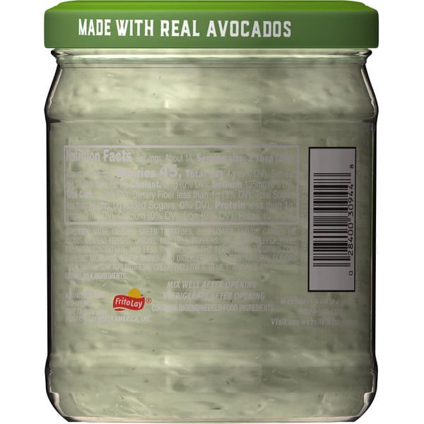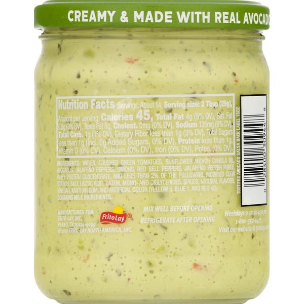 Water, Crushed Green Tomatoes, Sunflower And/or Canola Oil, Avocados, Jalapeno Peppers, Onions, Red Bell Peppers Jalapeno Pepper Puree, Whey Protein Concentrate, And Less Than 2% Of The Following Modified Corn I Starch, Salt, Lactic Acid, Datem, Mono- And Diglycerides, Spices, Natural Flavors, Vinegar, Xanthan Gum, And Artificial Color (yellow 5, Blue 1. And Red 40).