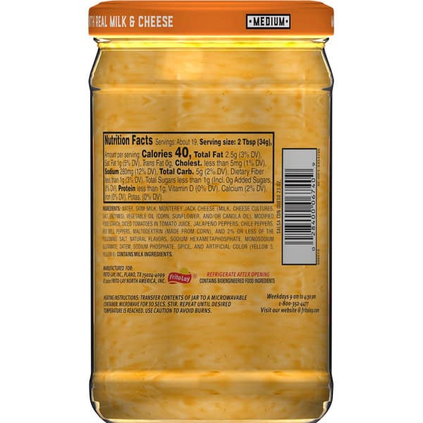 Water, Skim Milk, Monterey Jack Cheese (milk, Cheese Cultures, Salt, Enzymes), Vegetable Oil (corn, Sunflower, And/or Canola Oil), Modified Food Starch, Diced Tomatoes In Tomato Juice, Jalapeño Peppers, Chile Peppers, Red Bell Peppers, Maltodextrin (made From Corn), And 2% Or Less Of The Following: Salt, Natural Flavors, Sodium Hexametaphosphate, Monosodium Glutamate, Datem, Sodium Phosphate, Spice, And Artificial Color (yellow 5, Yellow 6).
