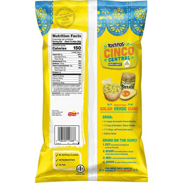 No artificial flavors. Gluten free. No preservatives. No MSG. Thin & crispy. Guaranteed fresh until printed date or this snack’s on us. fritolay.com. tostitos.com. Questions or Comments? 1-800-352-4477 Mon-Fri 9:00am to 4:30pm CT / email or chat at fritolay.com. Find more cinco-worthy recipes at tostitos.com! Try Tostitos Salsa Verde Guac!