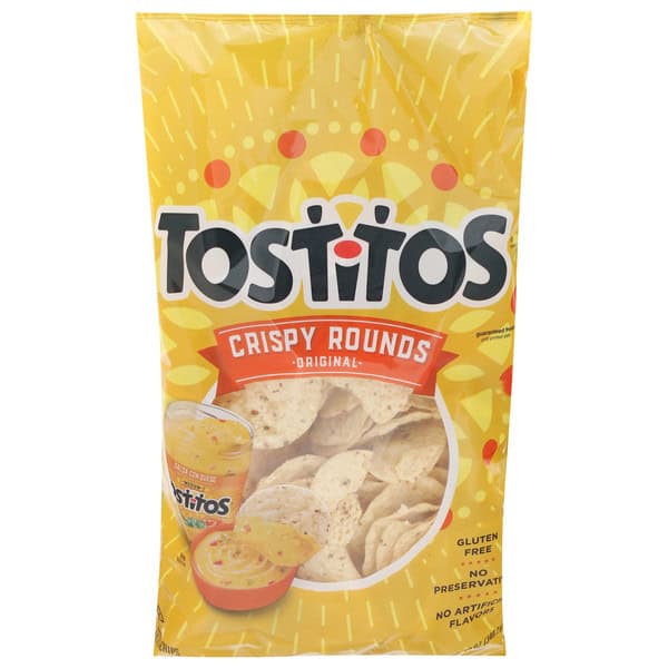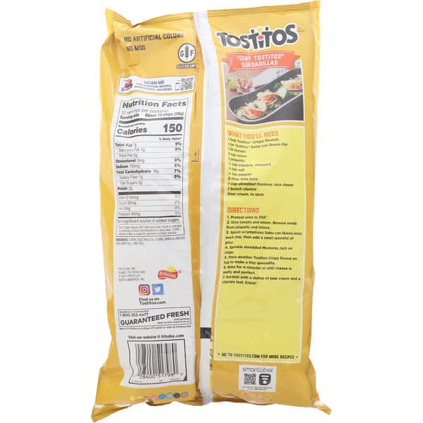 No artificial flavors. Gluten free. Party ’round the queso! Tostitos on party music. When it’s time to heat things up put on the salsa. Grab some Tostitos and get to the good stuff. No preservatives. No msg. Guaranteed fresh until printed date or this snack’s on us. fritolay.com. tostitos.com. Questions or comments? 1-800-352-4477 Mon-Fri 9:00am to 4:30pm CT / email or chat at fritolay.com. Party with us at tostitos.com.
